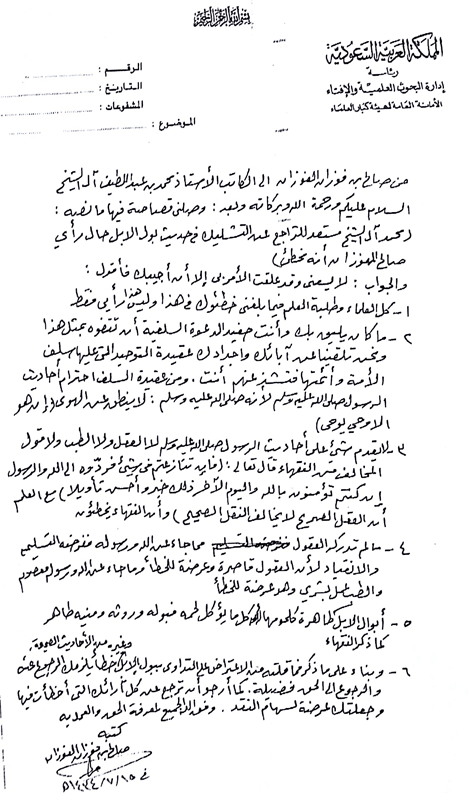 من صالح فوزان الفوزان إلى الكاتب الأستاذ محمد بن عبدا للطيف آل الشيخ