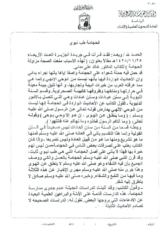الأربعاء 25/11/1428هـ مقالاً بعنوان: [لهذه الأسباب منعت الصحة مزاولة الحجامة]