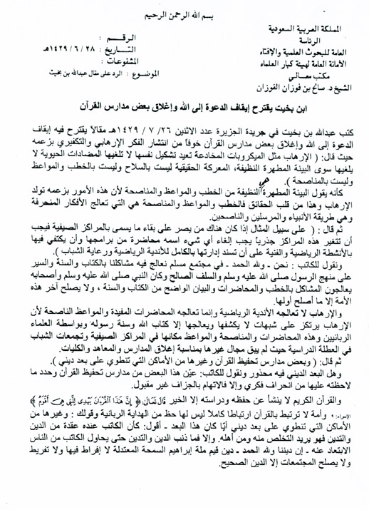 يقترح فيه إيقاف الدعوة إلى الله وإغلاق بعض مدارس القرآن خوفاً من انتشار الفكر الإرهابي